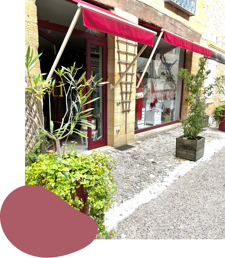 Bienvenue à la boutique Pour Elles, boutique reconnaissable entre toutes avec ses jolis stores rouges. Nichée au cœur de Monpazier, emblématique bastide du Périgord, notre petite boutique attire le regard avec sa grande vitrine encadrée de part et d‘autres de grands pots de fleurs rouges, comme une invitation à la découverte.