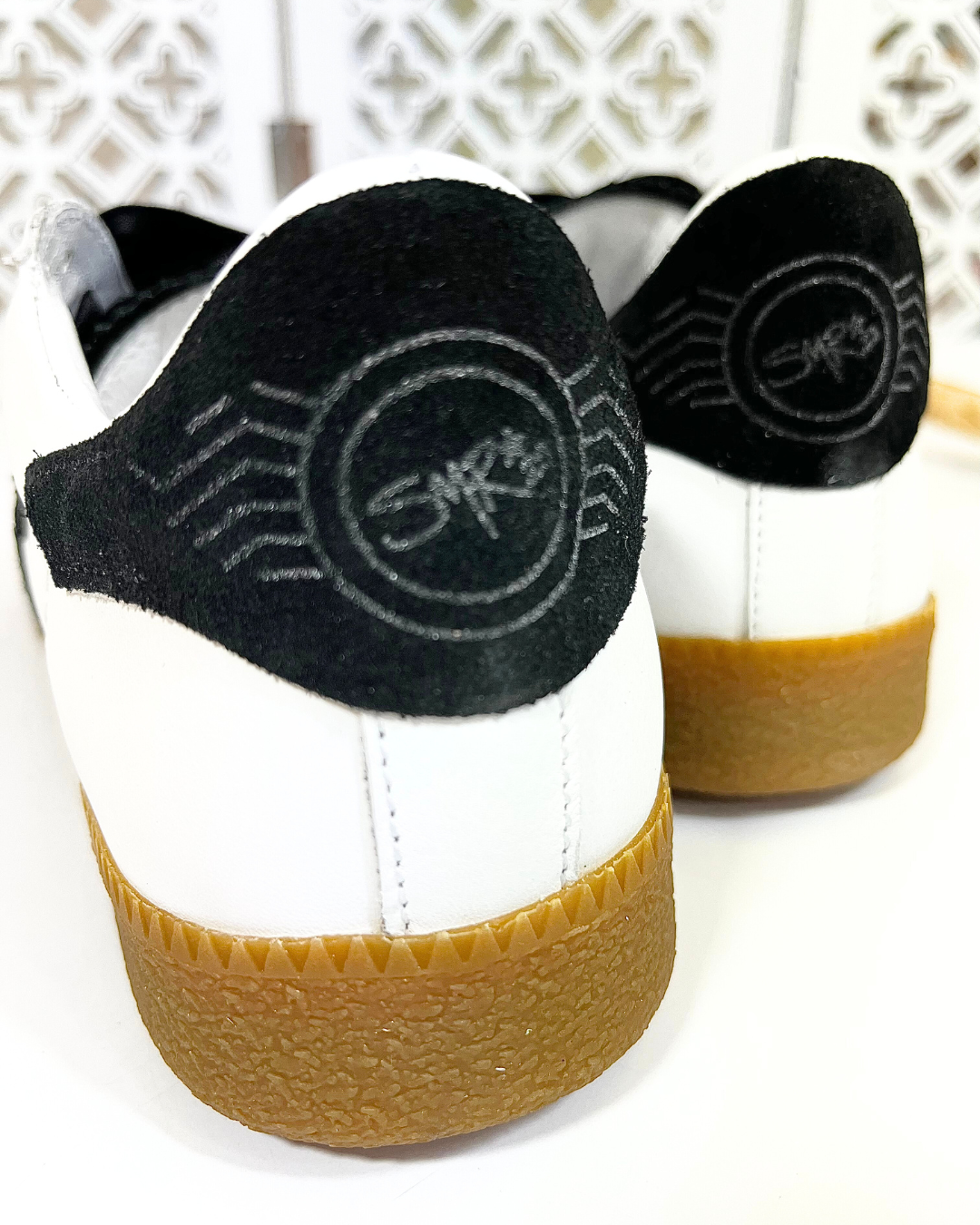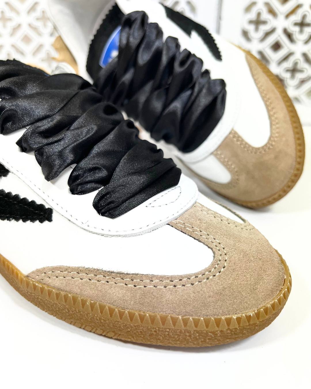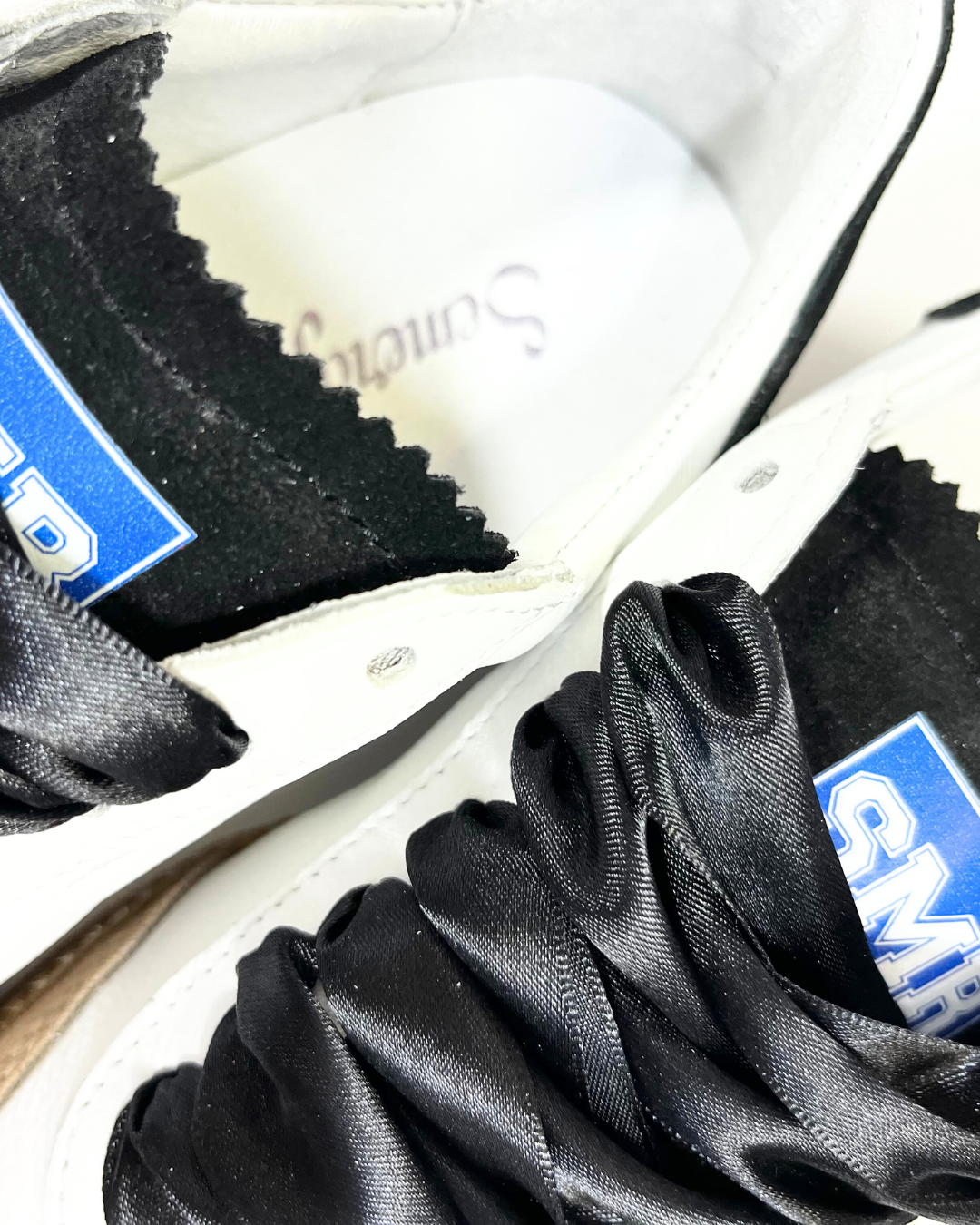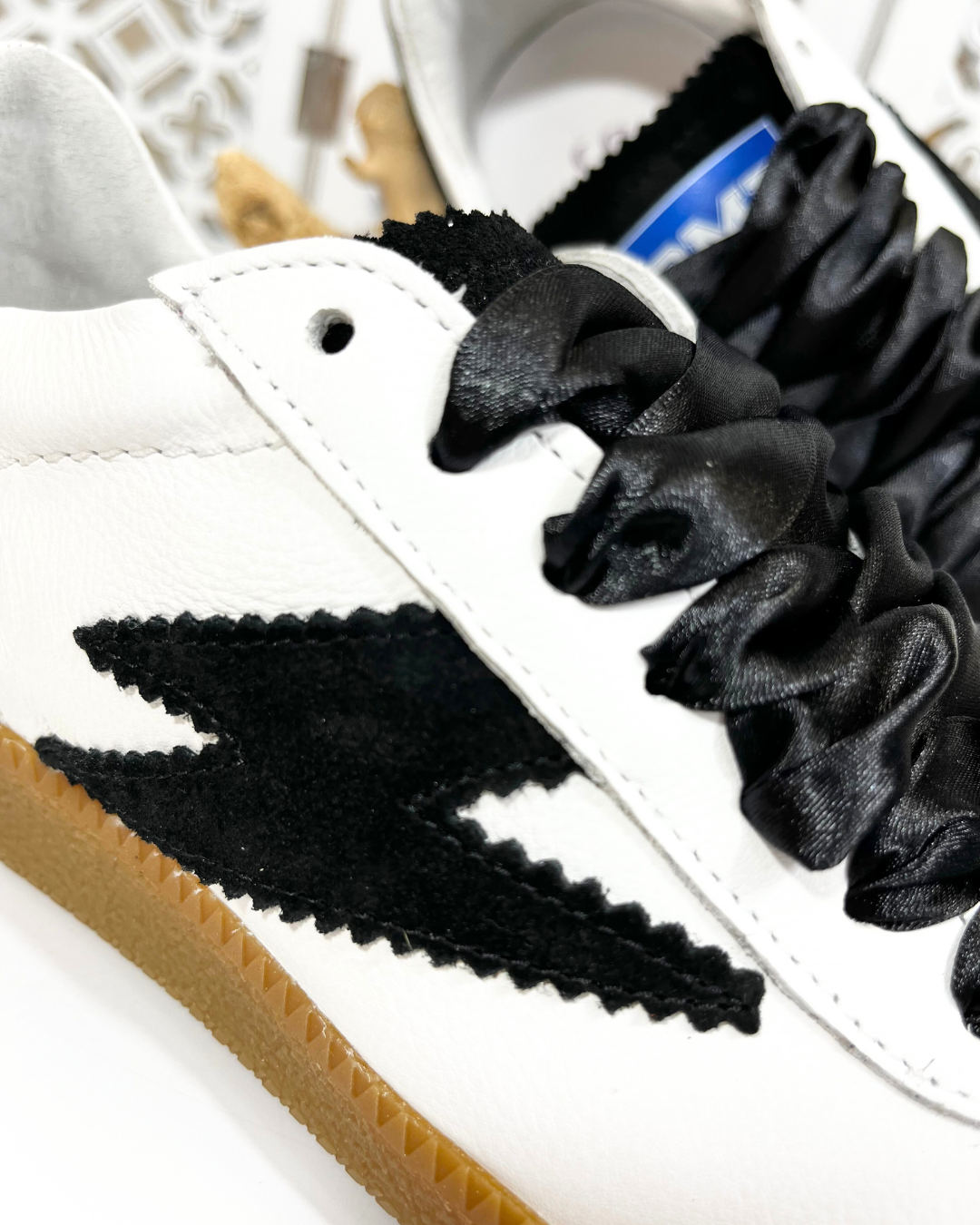 Les lacets satin noirs apportent une finition élégante et un contraste doux avec la teinte blanche du cuir.