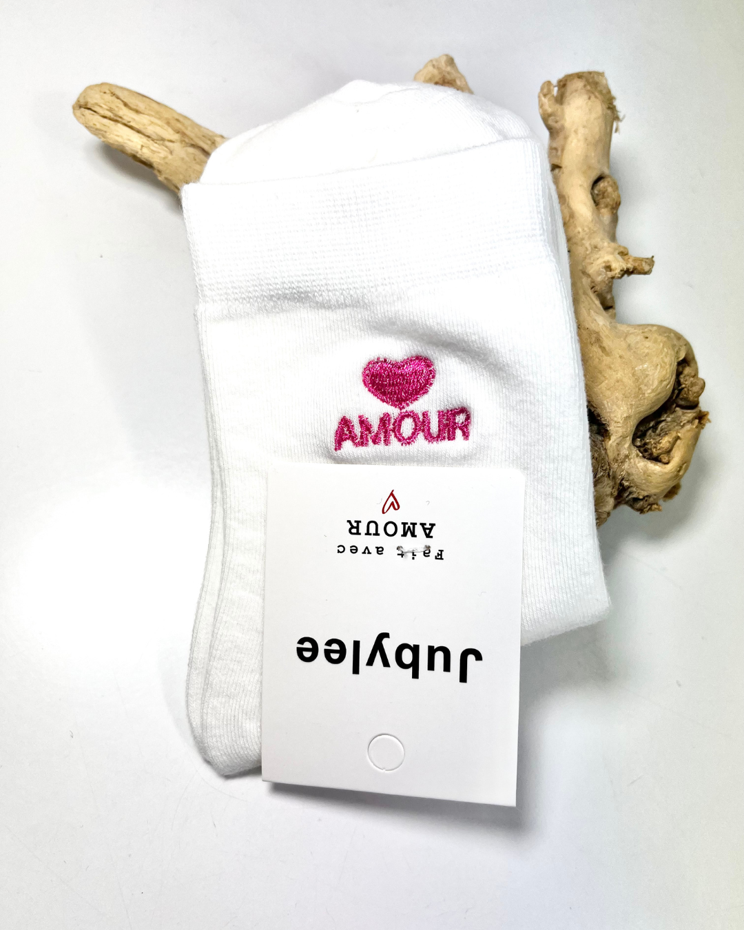 Unies blanches ou noires, ces chaussettes sont brodées du mot AMOUR surmonté d’un petit cœur brodé coordonné.