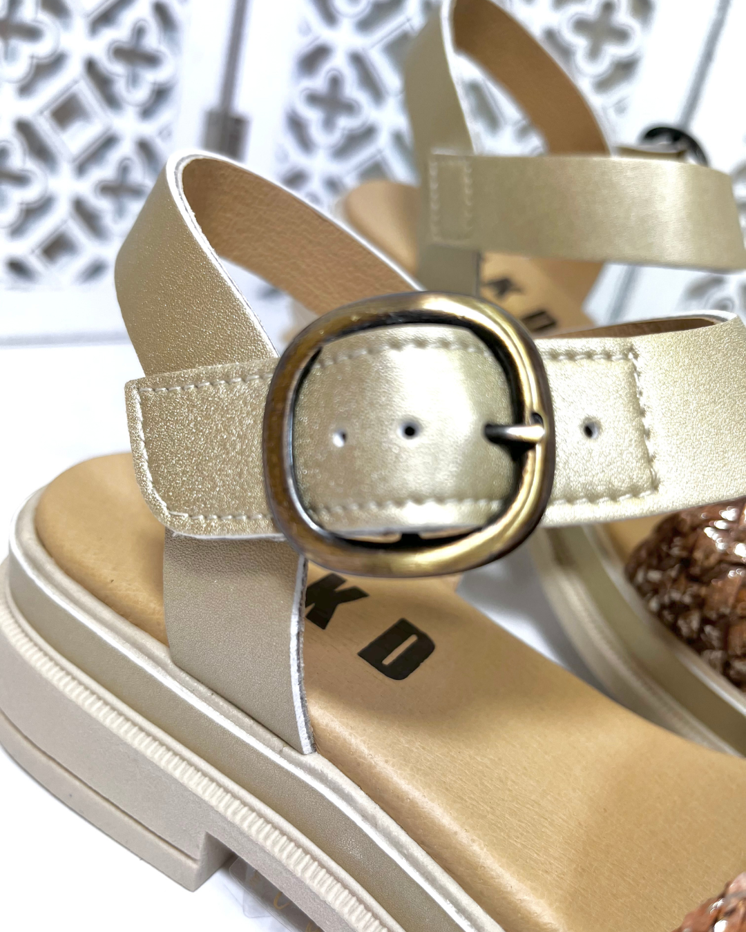Leur design épuré est sublimé à l’avant par une large bride en cuir tressé champagne, apportant une touche bohème chic. Tandis que la bride supérieure en cuir doré, munie d’une élégante boucle réglable, assure un maintien optimal tout en illuminant la silhouette.