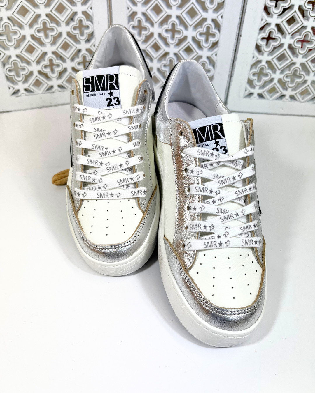 La languette en cuir blanc est surmontée d’une étiquette en tissu SMR23, tandis que les lacets blancs logotés SMR23 complètent harmonieusement l’ensemble. Une paire aussi confortable qu’unique, pour dynamiser vos tenues casual comme plus travaillées.
